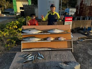 ブリ90〜95㎝ 3匹 大アジ、中アジ 25〜35㎝ 10匹 タイ30.35㎝ ハモ 120㎝ (センカイカセ)